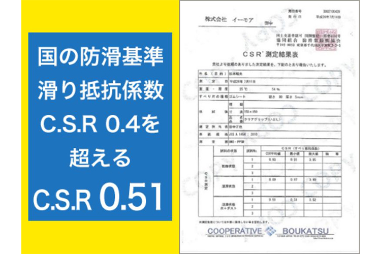 国の「高齢者、障害者等の円滑な移動等に配慮した建築設計標準」であるC.S.R(滑り抵抗係数)0.4以上に対して、クリアグリップは最も悪い湿潤状態の水+ダストの試験条件で「C.S.R0.51」を達成。その滑りにくさ(滑り止め効果)が証明されました。